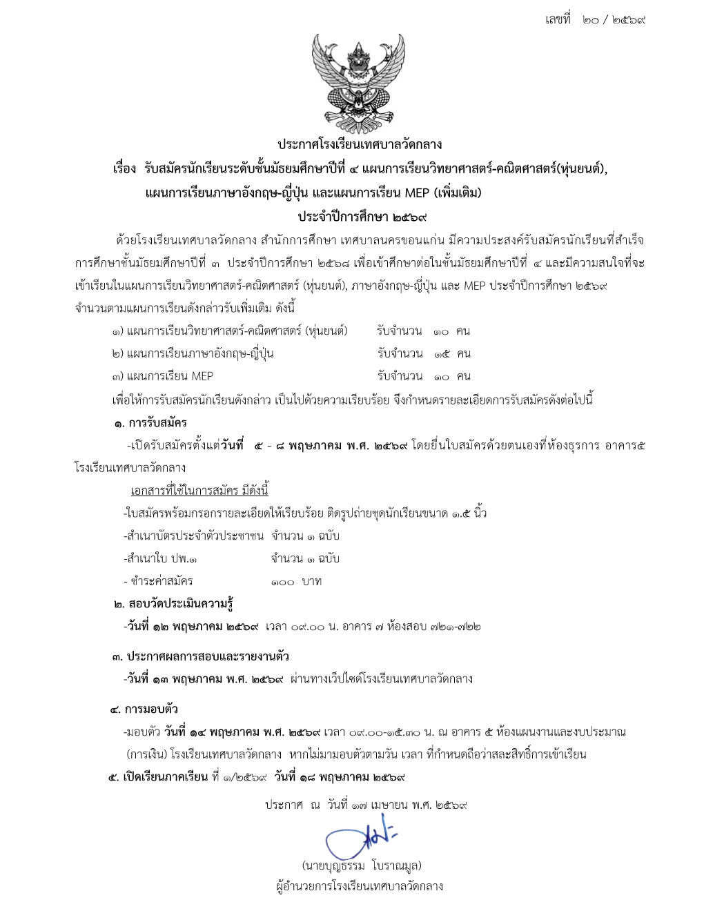 ประกาศรับสมัครนักเรียนใหม่ (รอบเพิ่มเติม หุ่นยนต์,ญี่ปุ่น,MEP) ปีการศึกษา 2569