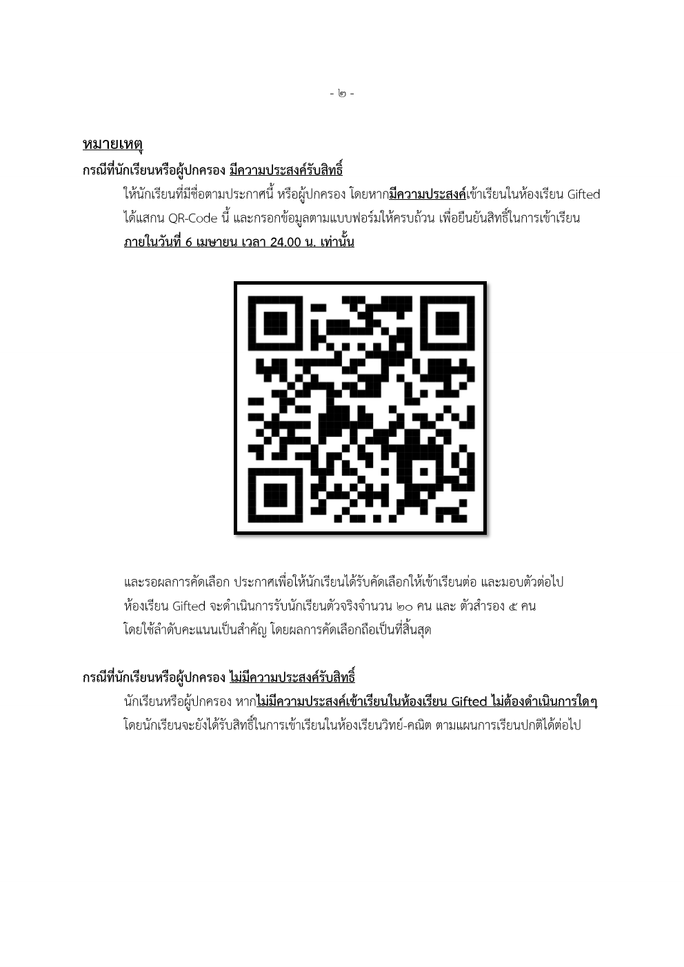 ให้ผู้ที่มีรายชื่อตามประกาศสายชั้นมัธยมศึกษาปีที่ 1 และมีความประสงค์จะเข้าเรียนห้องเรียนพิเศษ Gifted สแกน qr-code ตามเอกสารแนบ |